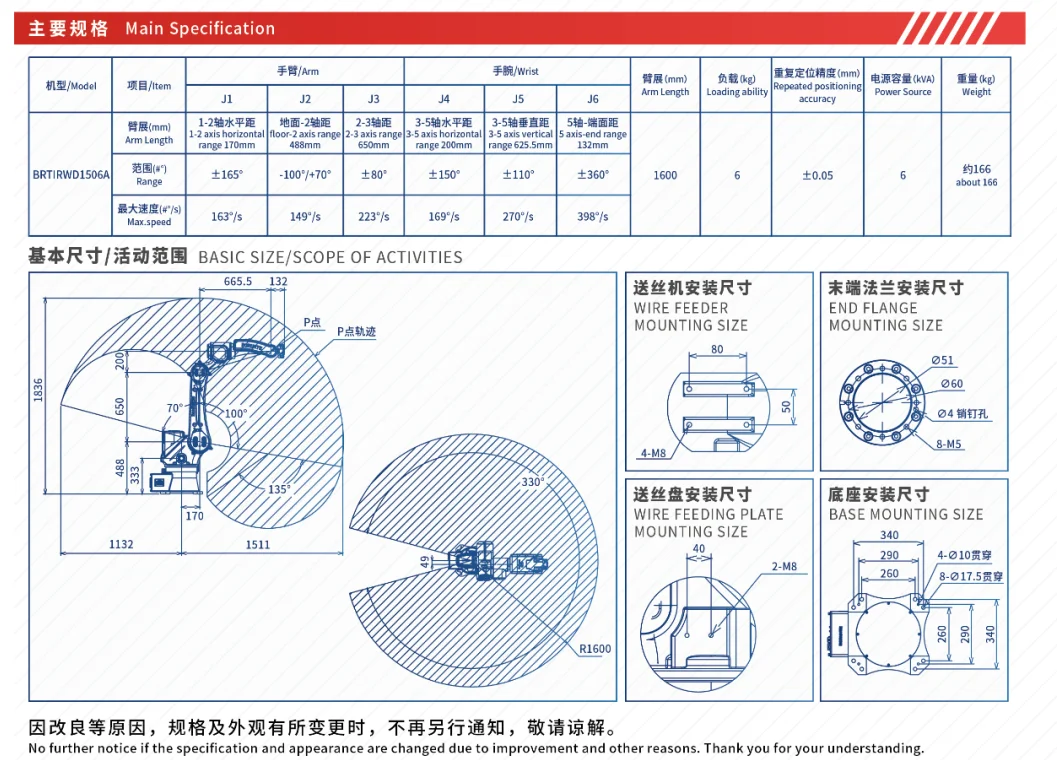 Jiangxi Longen Intelligent Equipment Co., Ltd. specializes in industrial robots for welding applications. The BRTIRWD1506A six-axis robot offers 1600mm span, 6kg load, and ±0.06mm precision. It features IP54 protection, servo motors, and harmonics reducers, with 1-year warranty. The company operates a 30,000m² factory and provides OEM options.